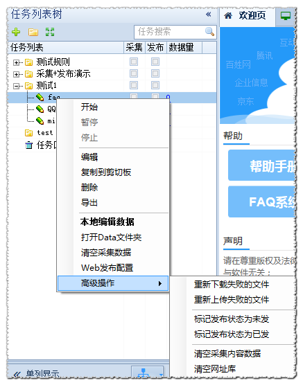 在任务上右击,支持开始,暂停,停止,编辑,删除,复制任务,导出任务,本地编辑数据,清空等功能。